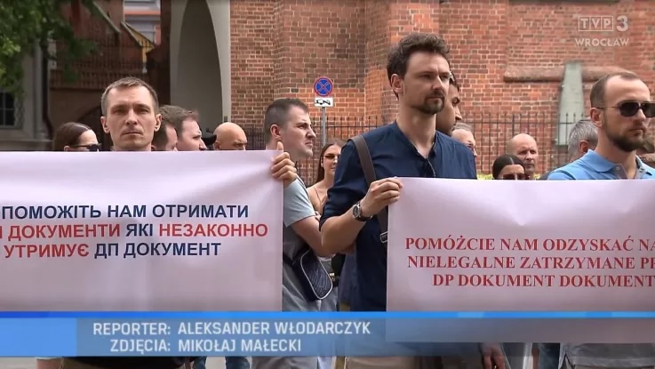 Близько 50 українців, головно чоловіки, прийшли сьогодні з пікетом під будівлю консульського відділу Посольства України у Варшаві. Люди тримали в руках плакати з написами: «Ми не раби, віддайте паспорти», «Стоп дискримінації українських чоловіків», «Паспорт – це право, а не привілей».